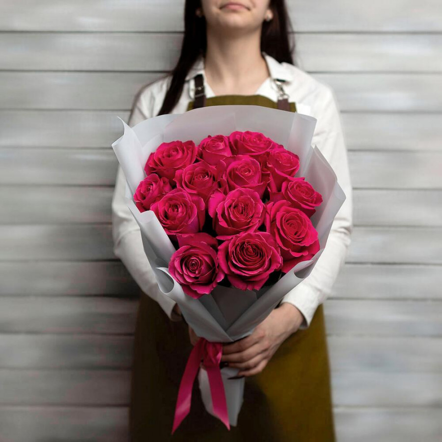 лента (за1м) - 1 шт. пленка прозрачная (за1м) - 1 шт. упаковка в ассортименте (за1м) - 1 шт. роза эквадор 5 малиновый - 13 шт.