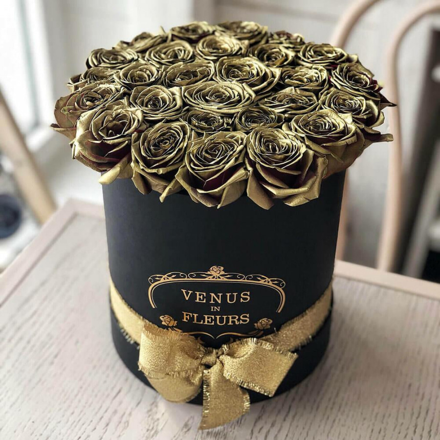На фото букет из 29 золотых роз в коробке. В составе: роза 29 шт, оазис флористический 2 шт, шляпная коробка (m) 1 шт, атласная лента 1 шт, . Все цветы свежие и ароматные, букет красиво оформлен и отлично подходит для подарка. Доступна доставка цветов или самовывоз.